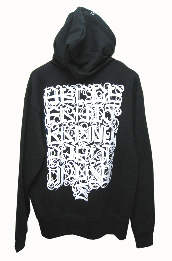 ART SIDE, 大阪のCASPER氏によるデザインのパーカーです。A~Zの文字のプリントで海外でグラフィティーライターによるA~Zのフォント本が発売されるらしく、その本と同デザインになります。10オンスフードパーカーです。