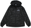 胸に"VANDALISM" 刺しゅう、後ろ側の裾にロゴ刺しゅうを、撥水性と防風性を備えた素材に、エンボス加工を施したタイガーカモのデザイン。 袖口はマジックテープで調整可能、フードドローコード、ファスナーはYKK社の ダブルスライダーを採用した優れたジャケットです。
