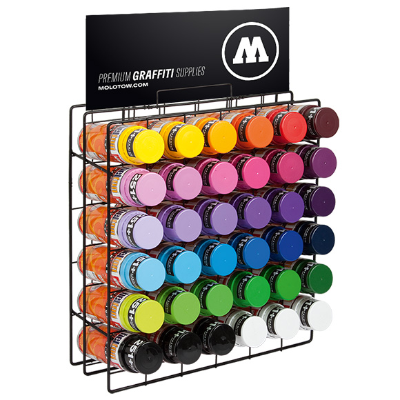 MOLOTOW™ PREMIUM スプレーラック 36です。 36本のスプレーが収納可能です。組み立て不要のラックになります。 サイズ:横45,5 x 高さ奥行き49,0 x 13,5cmです。
